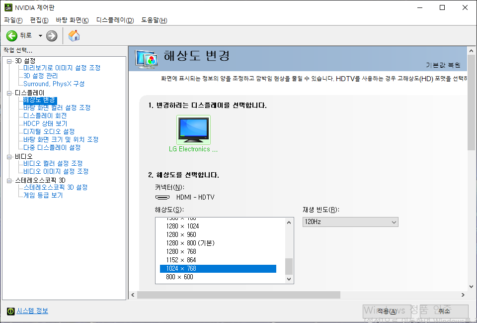드라이버 버전 낮추고, 해상도를 빔프로젝터 120Hz를 지원하는 1024x768로 변경.