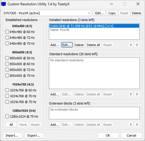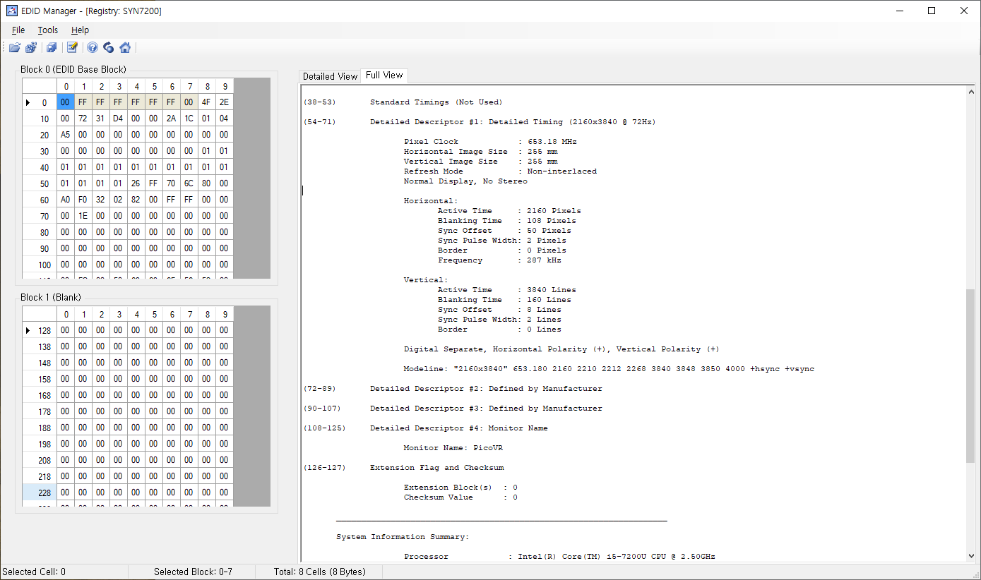| Time: 오전 10:28:55 Date: 2026년 2월 11일 수요일 EDID Manager Version: 1.0.0.14 ___________________________________________________________________ Block 0 (EDID Base Block), Bytes 0 - 127, 128 BYTES OF EDID CODE: 0 1 2 3 4 5 6 7 8 9 000 | 00 FF FF FF FF FF FF 00 4F 2E 010 | 00 72 31 D4 00 00 2A 1C 01 04 020 | A5 00 00 00 00 00 00 00 00 00 030 | 00 00 00 00 00 00 00 00 01 01 040 | 01 01 01 01 01 01 01 01 01 01 050 | 01 01 01 01 26 FF 70 6C 80 00 060 | A0 F0 32 02 82 00 FF FF 00 00 070 | 00 1E 00 00 00 00 00 00 00 00 080 | 00 00 00 00 00 00 00 00 00 00 090 | 00 00 00 00 00 00 00 00 00 00 100 | 00 00 00 00 00 00 00 00 00 00 110 | 00 FC 00 50 69 63 6F 56 52 00 120 | 00 00 00 00 00 00 00 00 (8-9) ID Manufacture Name : SYN (10-11) ID Product Code : 7200 (12-15) ID Serial Number : (16) Week of Manufacture : 42 (17) Year of Manufacture : 2018 (18) EDID Version Number : 1 (19) EDID Revision Number: 4 (20) Video Input Definition : Digital DFP 1.x Compatible (21) Maximum Horizontal Image Size: 0 cm (22) Maximum Vertical Image Size : 0 cm (23) Display Gamma : 1.00 (24) Power Management and Supported Feature(s): MonochromeNon-sRGB (25-34) Color Characteristics Red Chromaticity : Rx = 0.000 Ry = 0.000 Green Chromaticity : Gx = 0.000 Gy = 0.000 Blue Chromaticity : Bx = 0.000 By = 0.000 Default White Point: Wx = 0.000 Wy = 0.000 (35) Established Timings I (Not Used) (36) Established Timings II (Not Used) (37) Manufacturer's Timings (Not Used) (38-53) Standard Timings (Not Used) (54-71) Detailed Descriptor #1: Detailed Timing (2160x3840 @ 72Hz) Pixel Clock : 653.18 MHz Horizontal Image Size : 255 mm Vertical Image Size : 255 mm Refresh Mode : Non-interlaced Normal Display, No Stereo Horizontal: Active Time : 2160 Pixels Blanking Time : 108 Pixels Sync Offset : 50 Pixels Sync Pulse Width: 2 Pixels Border : 0 Pixels Frequency : 287 kHz Vertical: Active Time : 3840 Lines Blanking Time : 160 Lines Sync Offset : 8 Lines Sync Pulse Width: 2 Lines Border : 0 Lines Digital Separate, Horizontal Polarity (+), Vertical Polarity (+) Modeline: "2160x3840" 653.180 2160 2210 2212 2268 3840 3848 3850 4000 +hsync +vsync (72-89) Detailed Descriptor #2: Defined by Manufacturer (90-107) Detailed Descriptor #3: Defined by Manufacturer (108-125) Detailed Descriptor #4: Monitor Name Monitor Name: PicoVR (126-127) Extension Flag and Checksum Extension Block(s) : 0 Checksum Value : 0 ___________________________________________________________________ System Information Summary: Processor : Intel(R) Core(TM) i5-7200U CPU @ 2.50GHz Operating System : Microsoft Windows 10 Home OS Version : 10.0.19045 Service Pack : 0.0 Video Controler: Device ID : VideoController1 Name : Intel(R) HD Graphics 620 Adapter Compatibility: Intel Corporation Video Processor : Intel(R) HD Graphics Family Video RAM : 1.00 GB (1,073,741,824 Bytes) Availability : Running or Full Power Driver Version : 26.20.100.7324 PNP Device ID : PCI\VEN_8086&DEV_5916&SUBSYS_C148144D&REV_02\3&11583659&0&10 Resolution : 1920x1080 Max Refresh Rate : 59 Hz Min Refresh Rate : 48 Hz Current Refresh Rate : 59 Hz Current Scan Mode : None-Interlaced Status : OK ___________________________________________________________________ |