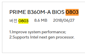 bios는 현재 0803 이고 2018년 6월 버전인데
